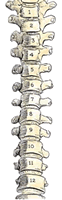 胸椎、一般的には背中の中ほどの骨のことを指しますが、これは12個の椎骨から成り立っています。(T1-T12)ここが背骨全体の中で一番長い部分です。椎骨のそれぞれが一対の肋骨とつながっています。これら椎骨から伸びている神経は筋肉、その他の表面組織、そして内臓に通じています。いくつかの神経は肘から前腕、手、指の表面組織にもつながっています。また、背中の中ほどの筋肉、胸の筋肉、胸郭の筋肉も、この部分の神経に支配されています。痛み、麻痺、その他の筋骨格の問題はこの部分のSubluxationによって起こる可能性のある症状の一部です。